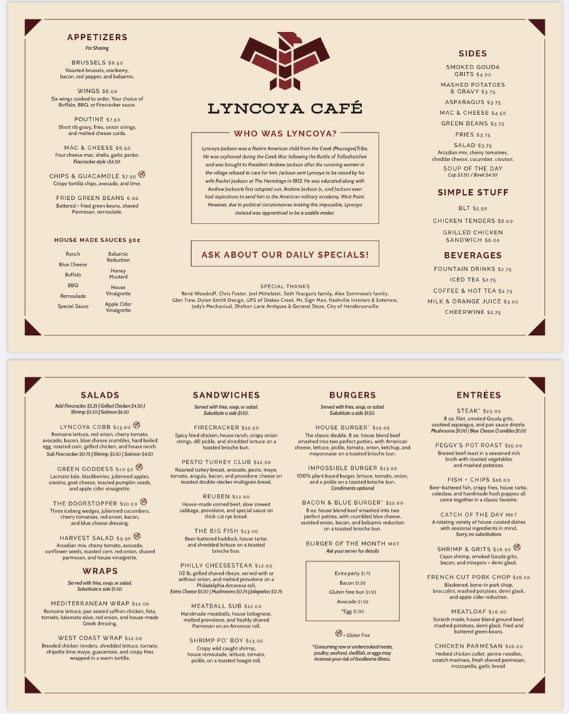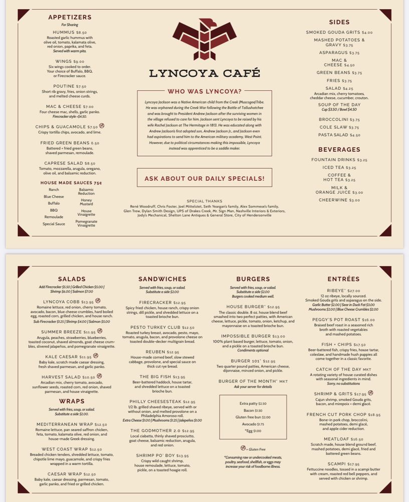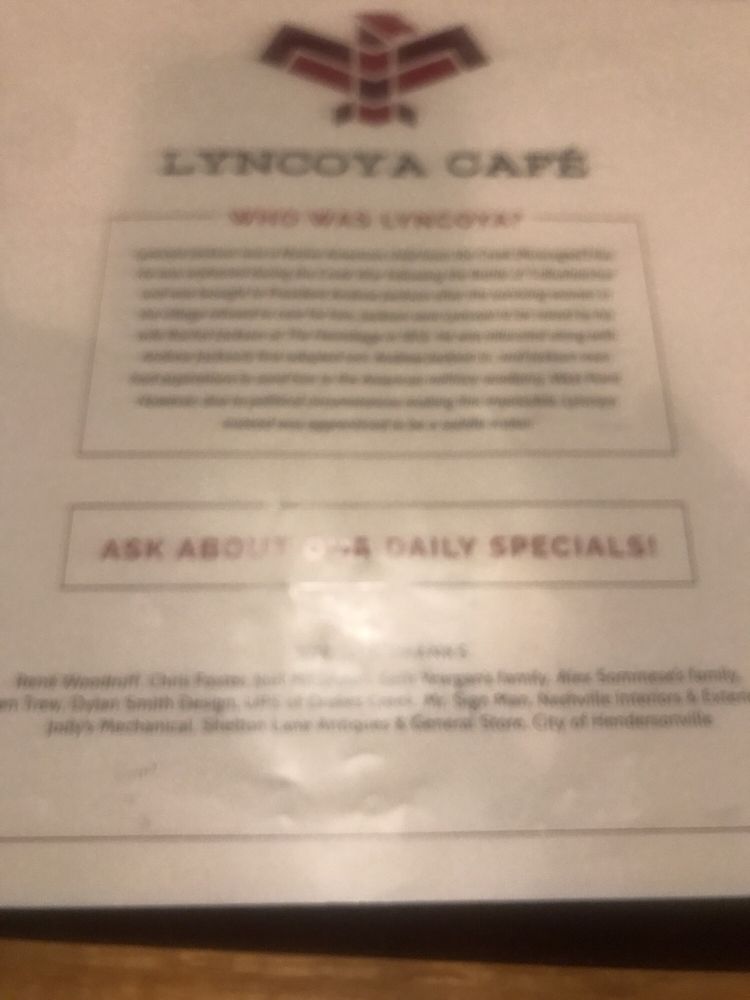 Introducing Lyncoya Cafe, a trendy and casual spot in Hendersonville, TN, offering a diverse menu of American and salad options. With a full bar, private dining, outdoor seating, and wheelchair accessibility, Lyncoya Cafe caters to a variety of preferences. Customers rave about the friendly service and delicious food, such as the Firecracker Mac and Cheese, Poutine, and the Fish and Fries. The house-made sauces and beverages like Iced Tea are also worth trying. Whether you're looking for a cozy brunch spot or a satisfying dinner, Lyncoya Cafe has something for everyone. Don't miss out on the flavorful dishes and relaxed atmosphere at this local gem.
